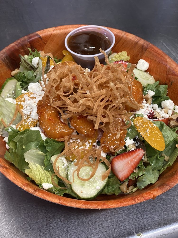 Mixed greens Served in a fried tortilla shell topped with black bean corn salsa, cheddar cheese, cucumber, olives, tomatoes, sour cream, guacamole and your choice of dressing.