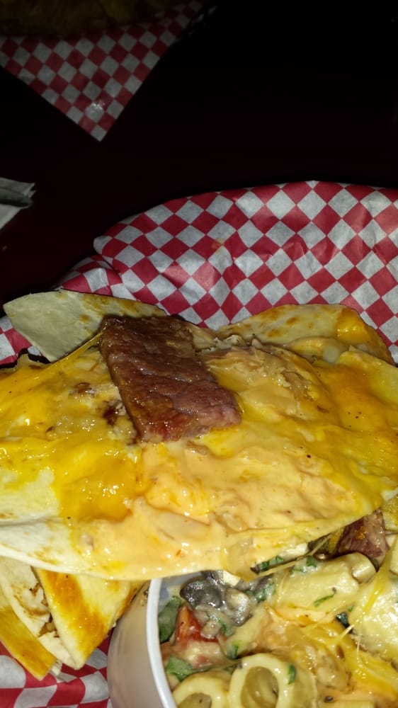 Sliced steak, cheddar cheese, onions, peppers, salsa and sour Cream.