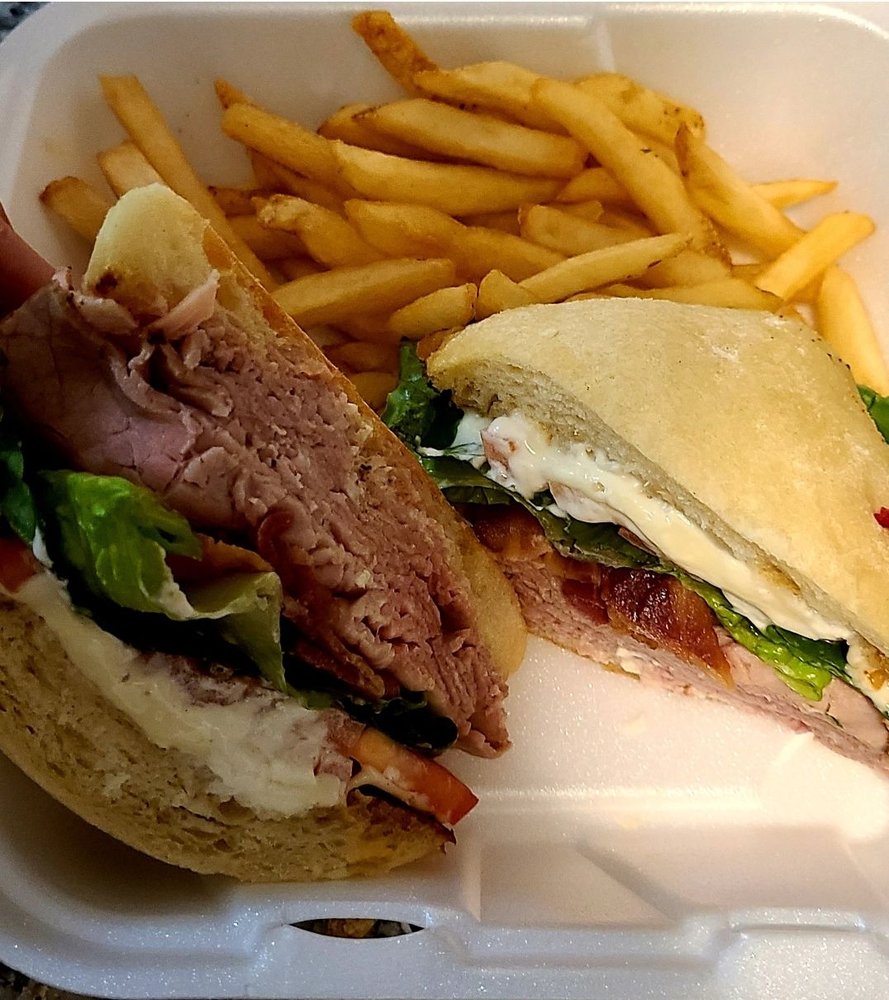Turkey or roast beef, on your choice of toasted white, wheat or marble rye bread, with bacon, lettuce, tomato and mayonnaise.